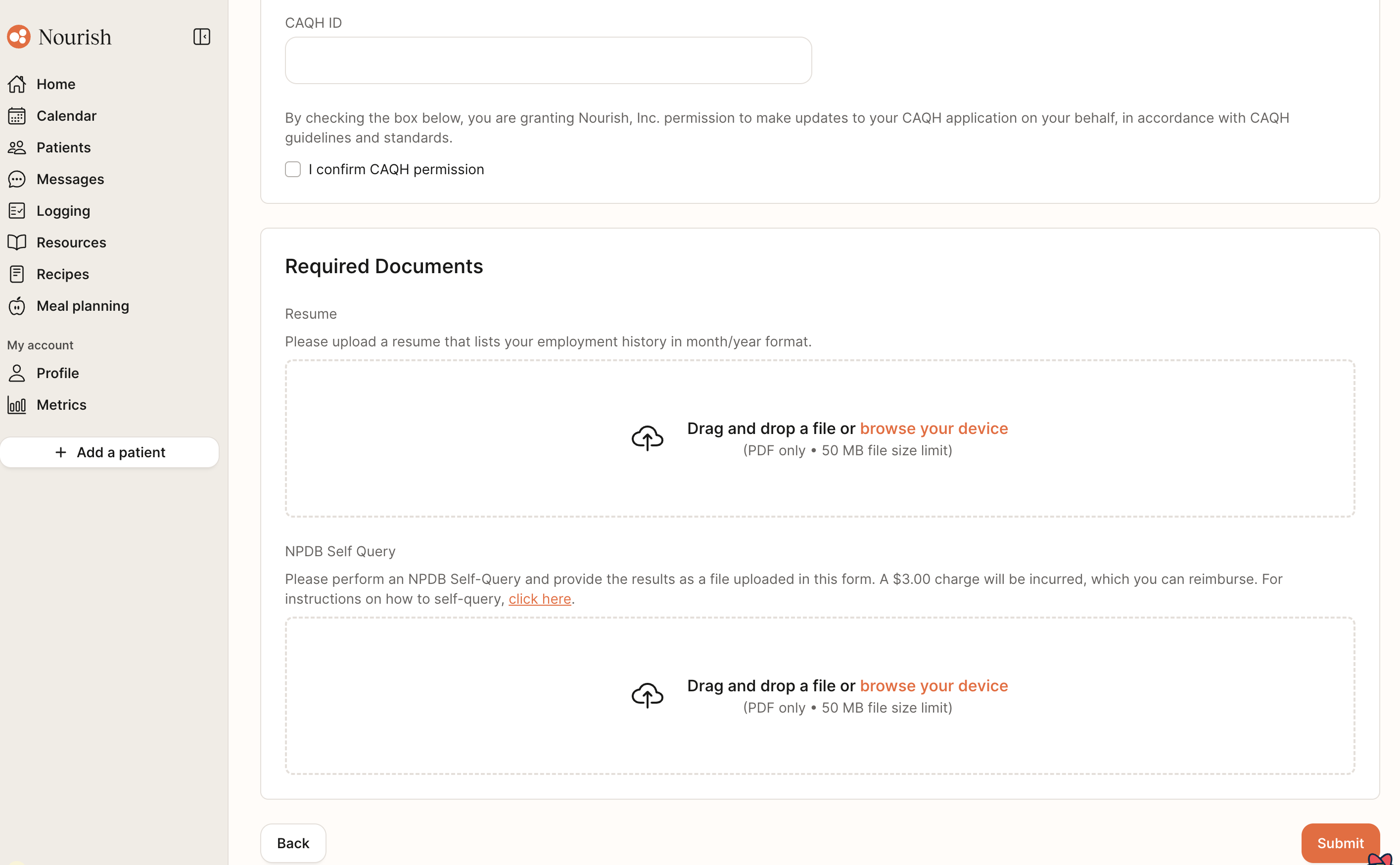 You’ll also provide your CAQH login information and select your opt-in status (whether Nourish updates your CAQH for you).