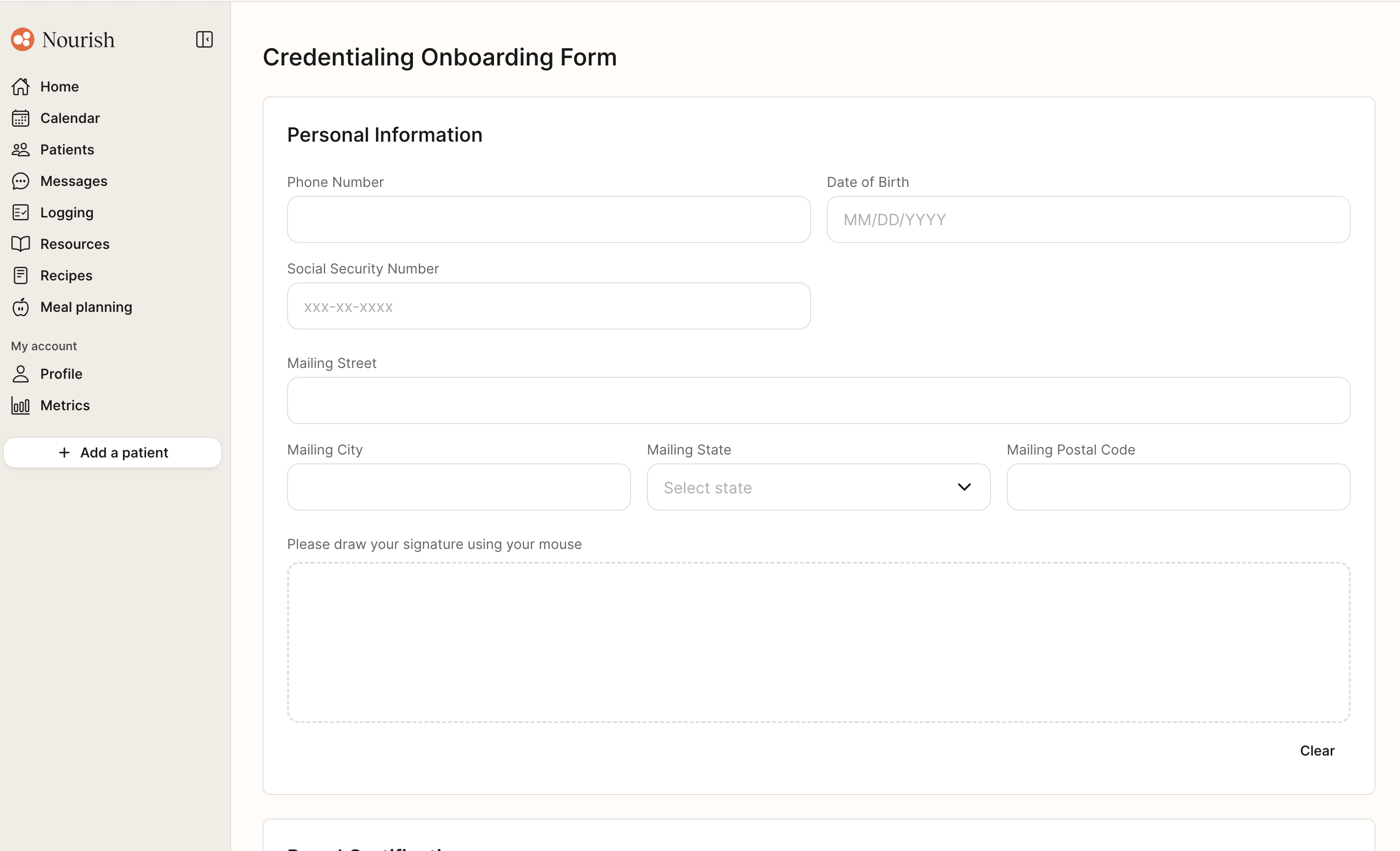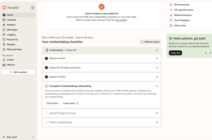 Note: If you joined Nourish before December 1, 2025, your dashboard may show the Verifiable Onboarding Form task instead. In that case, you will complete your credentialing onboarding form through Verifiable. Please refer to this help center article for detailed instructions on completing the Verifiable form.