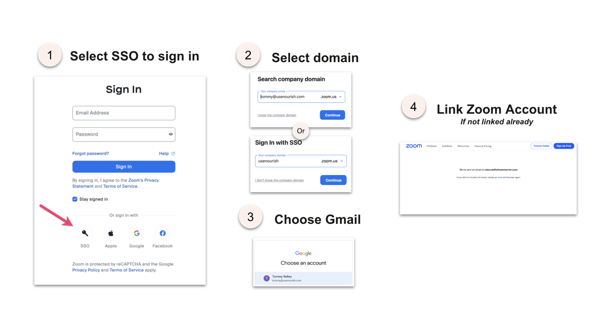 Before your first session, please log into Zoom using Single Sign On (SSO). Instructions are below; just make sure you’re logged in to your Nourish email in the relevant browser.