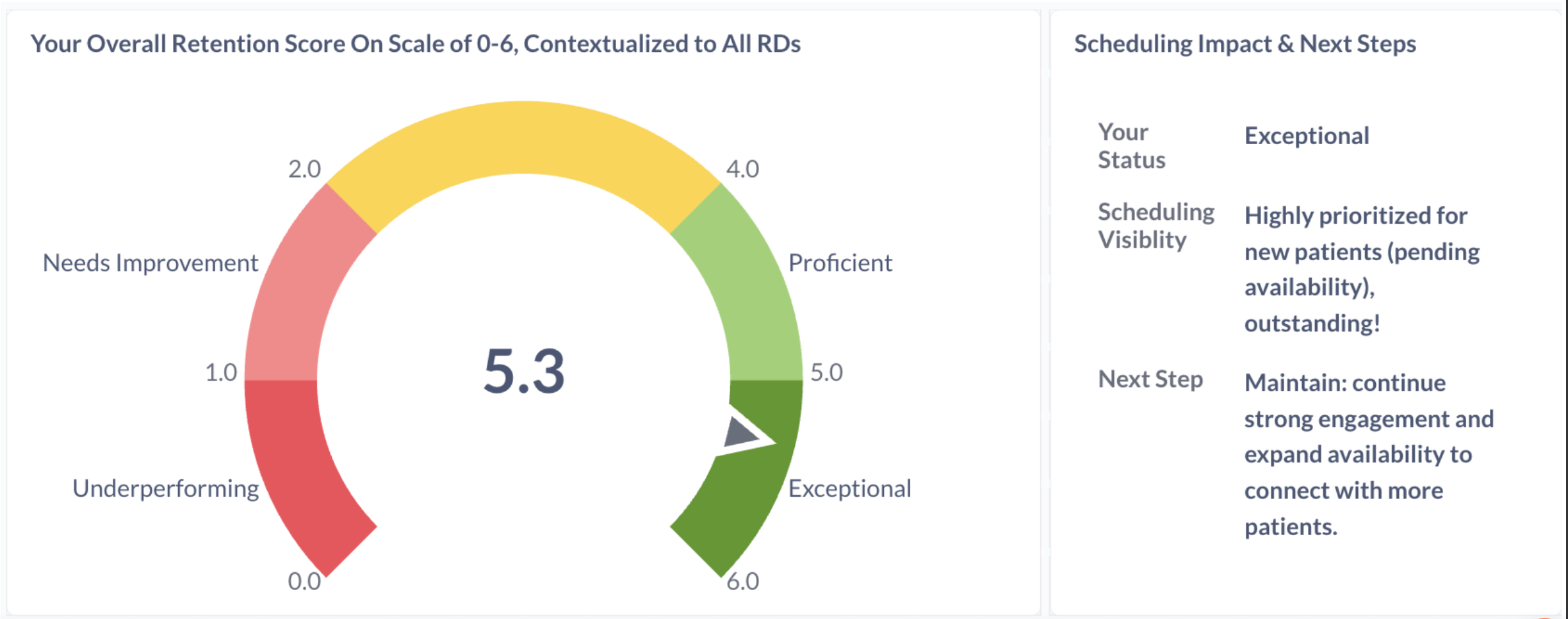 This section shows your overall retention score on a 0–6 scale. (As a new RD, this data will continue to populate (and will reflect your all-time retention so far) but does not impact scheduling during your onboarding phase.)