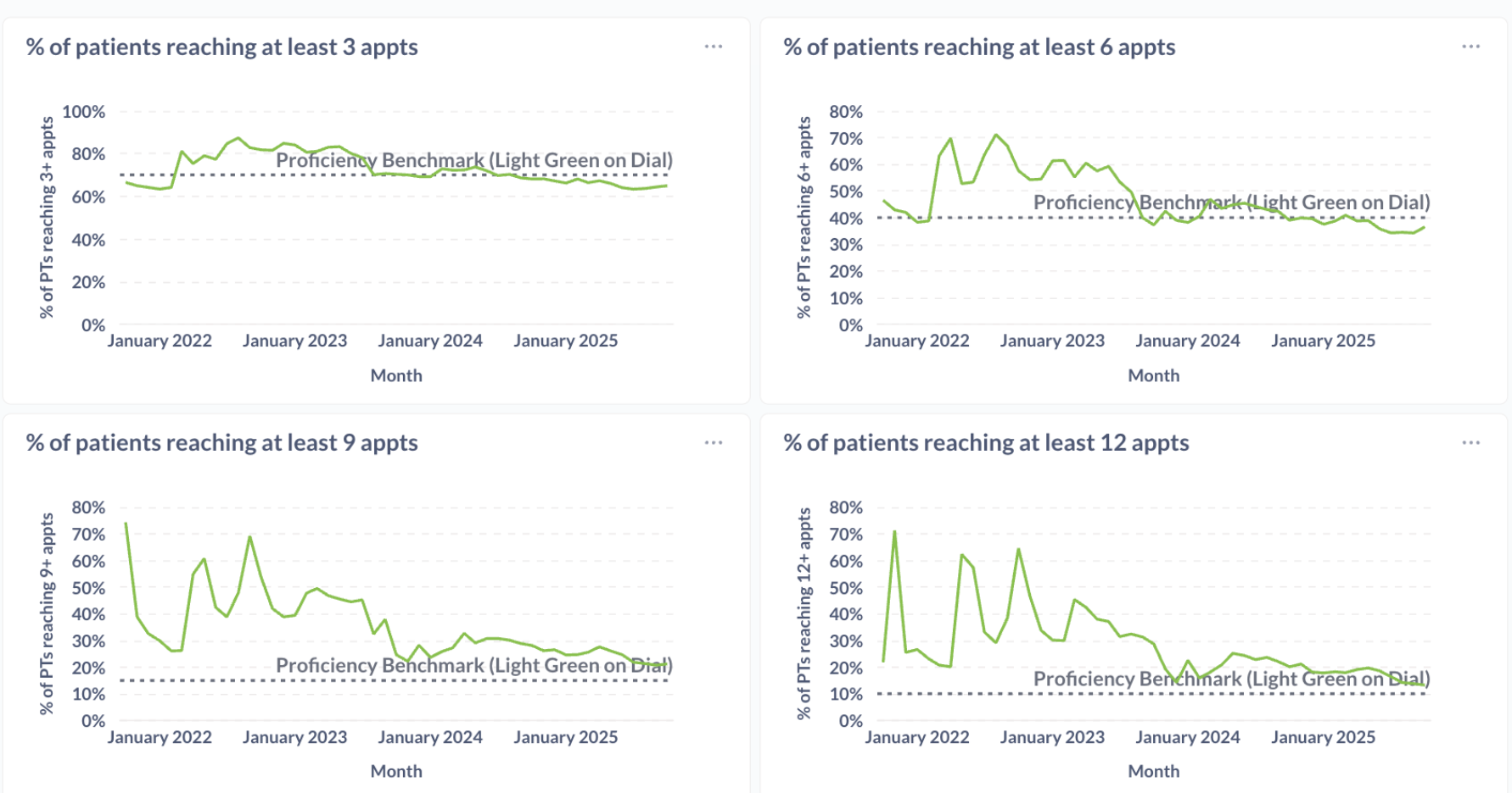 Below each dial, you’ll see how many additional patients would need to reach that milestone to move into the next color band. For example, “13 new patients to reach 3 appts” means that if 13 more patients from your current caseload reached 3 sessions, the dial would shift into the next range (such as from yellow to green).