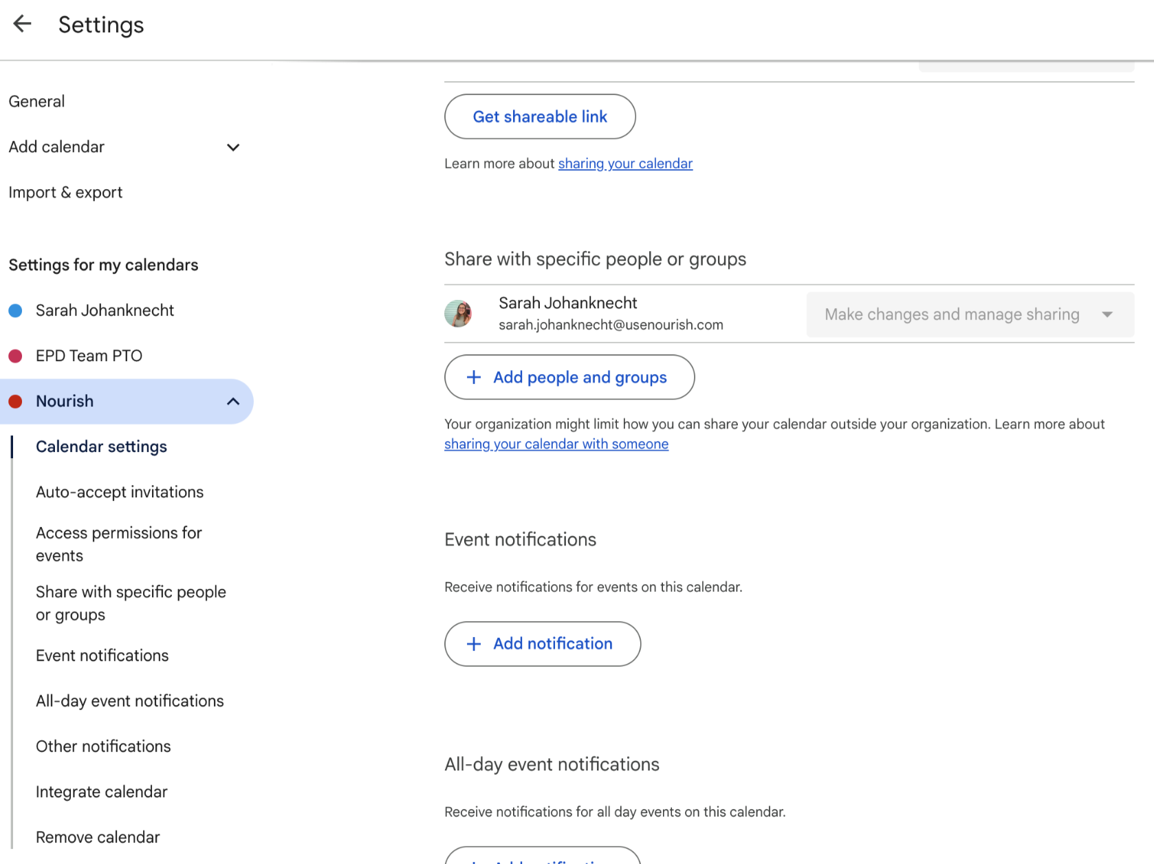 Then, you'll want to navigate to the settings page in your usenourish.com Google Calendar, select the Nourish calendar under Settings from my calendar. Lastly, under "share with specific people or groups," you will want to add your personal Gmail account.