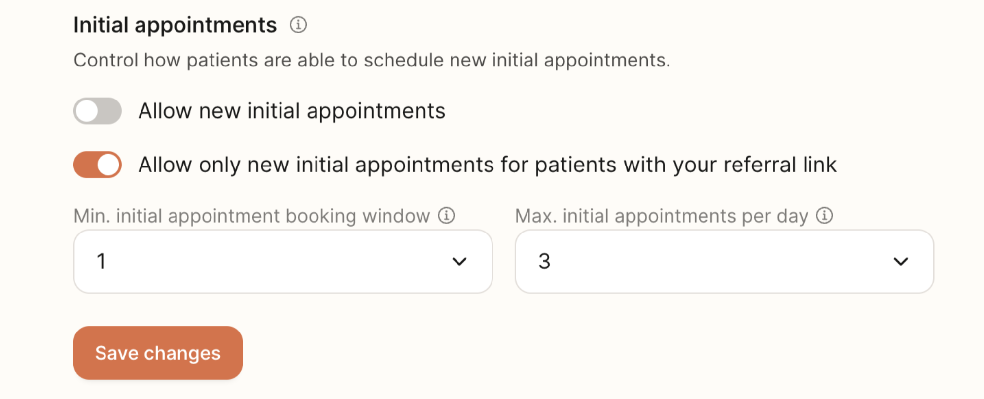 Allow only new initial appointments for patients with your referral link: With this setting, you can block initial appointments from Nourish-sourced patients, while still allowing those who visit your profile via your unique referral link in our provider directory to see and book any available time slots on your calendar.