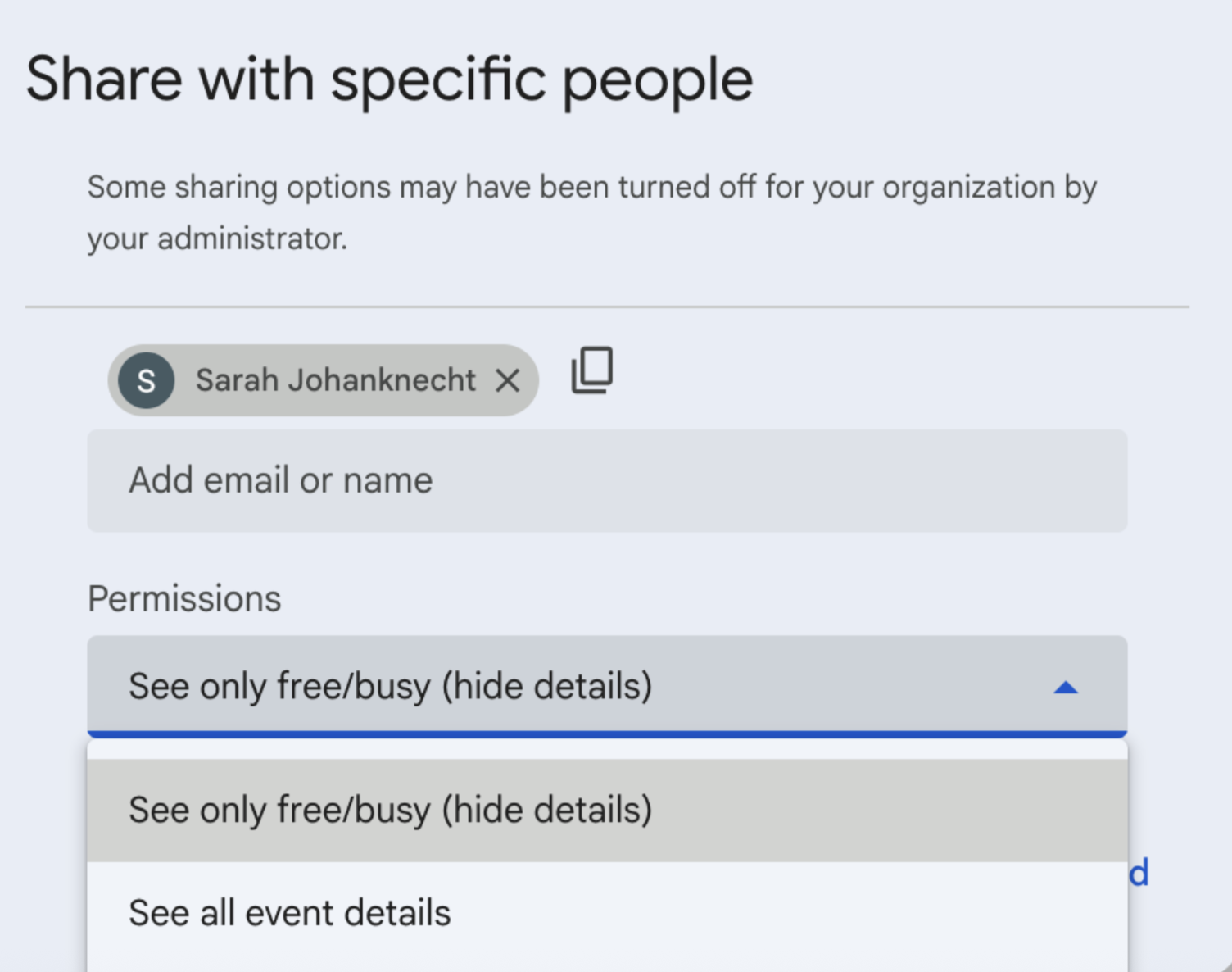 Your Nourish Google Cal will surface patient names in scheduled session events. To hide patient names on personal calendars you sync to your Nourish Google Cal, simply set permissions to "See only free/busy (hide details)".