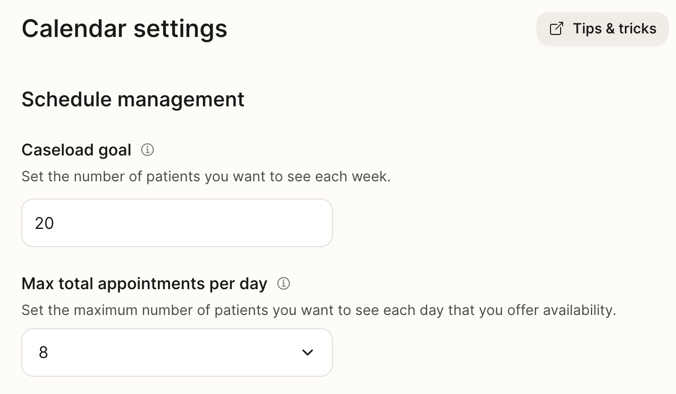 Max total appointments per day: Maximum number of both initial and follow-up sessions you want to be scheduled in a single day.
