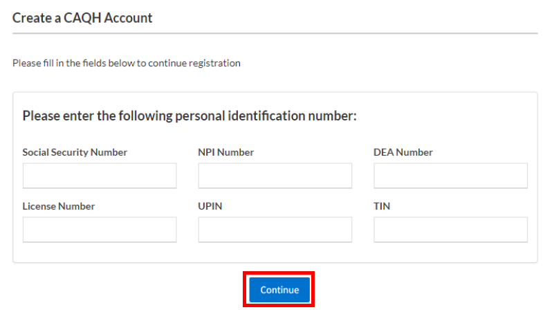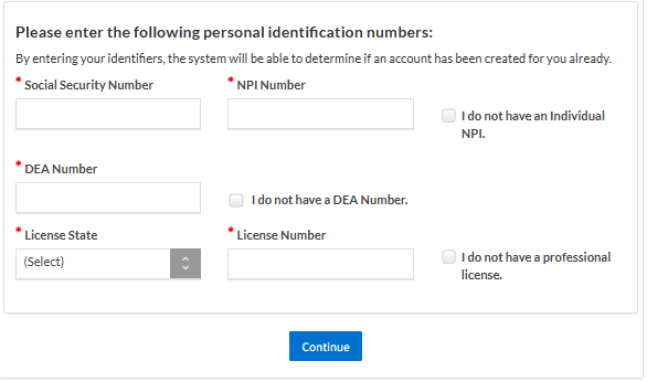 Enter your personal identification numbers (such as SSN, NPI, license info), then click Continue to proceed to creating a username and password