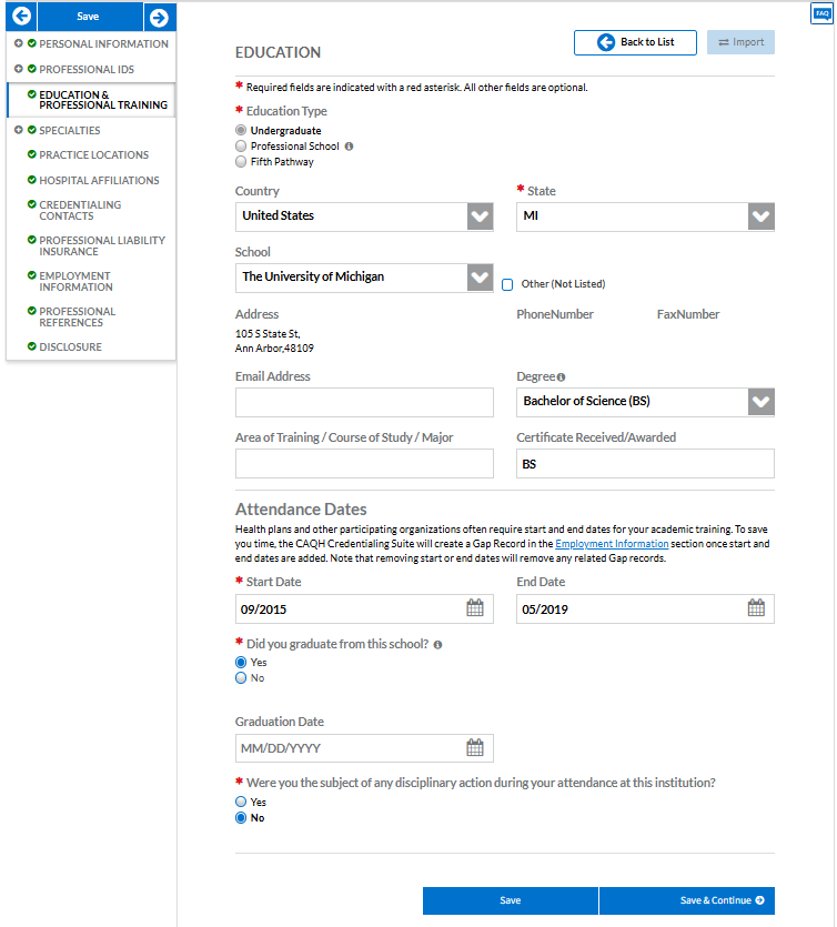 Payers require an explanation for any employment gaps longer than 60 days, and your education records help automatically fill those gaps.